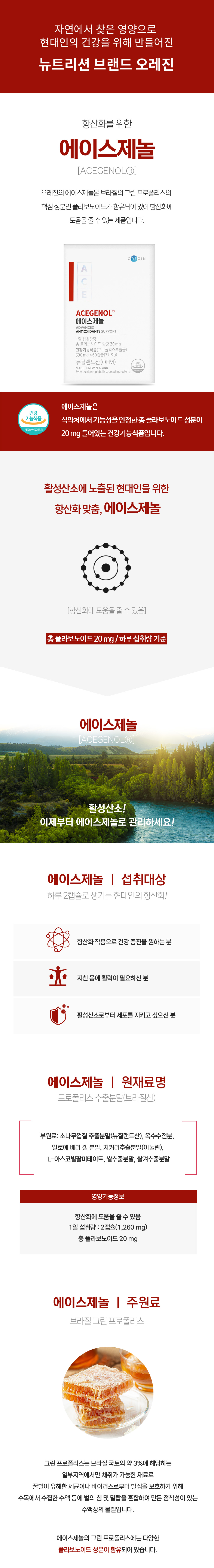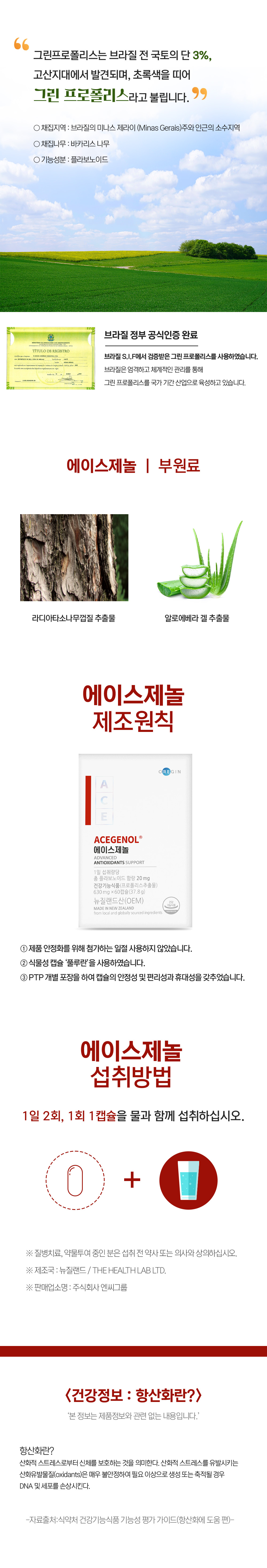 [에이스제놀] 1. 원재료명: 프로폴리스추출분말(브라질산), 소나무껍질추출분말(뉴질랜드산), 옥수수전분, 알로에베라 겔 분말, 치커리추출분말, L-아스코빌팔미테이트, 쌀추출분말, 쌀겨추출분말 [캡슐기제: 풀루란]