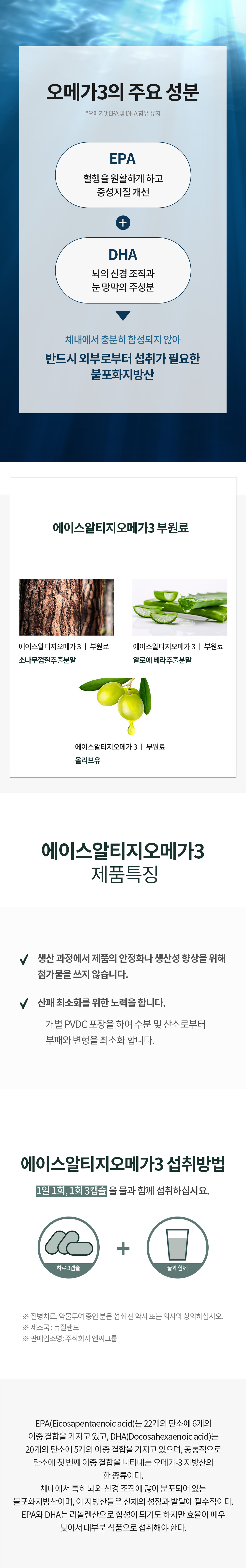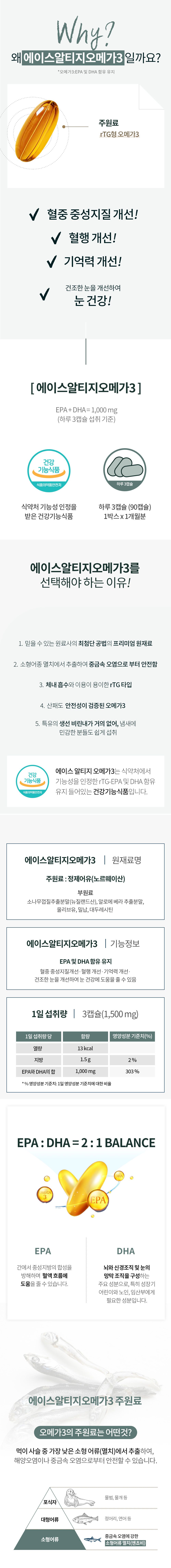 [에이스알티지오메가3] 영양/기능정보: [EPA 및 DHA 함유 유지] 혈중 중성지질 개선. 혈행 개선. 기억력 개선. 건조한 눈을 개선하여 눈 건강에 도움을 줄 수 있음.