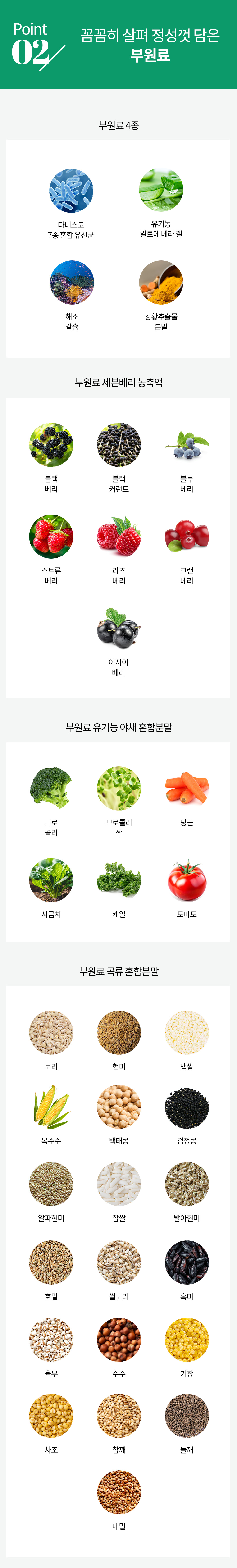브덴), 건조효모(비타민D), 건조효모(비타민B12), 덱스트린, 이소말트, 옥수수전분, 유채경화유분말, 해조혼합분말, 대나무수액추출분말, 타마린드검, 세븐베리농축분말, 알로에 겔, 7종 혼합유산균, 곡물혼합분말, 혼합야채분말, 강황추출물분말, 레시틴 [토마토, 대두, 메밀, 밀 함유] [내포장재질] 알루미늄호일(Al-foil), 폴리염화 비닐리덴(PVDC)