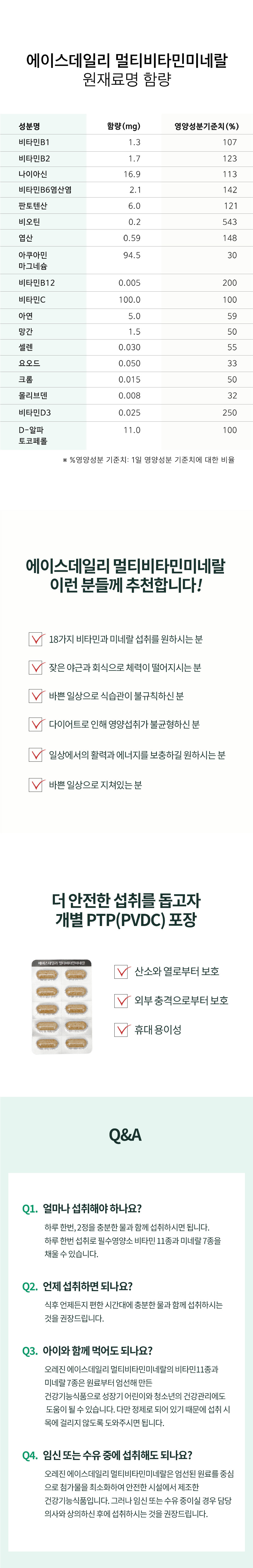 [에이스데일리] 1. 원료명 및 함량: 건조효모(나이아신, 판토텐산, 비타민B6염산염, 비타민B2, 비타민B1염산염, 엽산, 비오틴), 혼합제제(수산화마그네슘, 옥수수전분), 인디안구스베리추출물분말, 건조효모(아연), 건조효모(망간), 건조효모(셀렌), d-α-토코페릴호박산, 건조효모(요오드), 건조효모(크롬), 건조효모(몰리